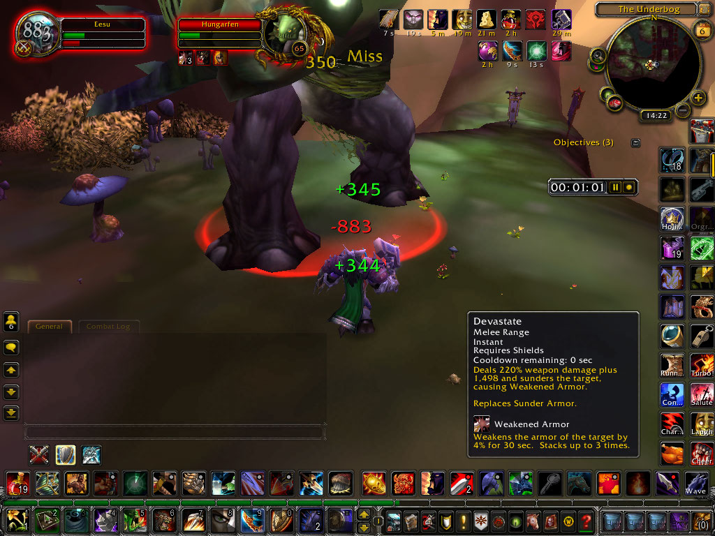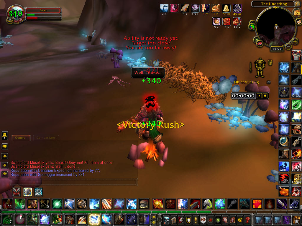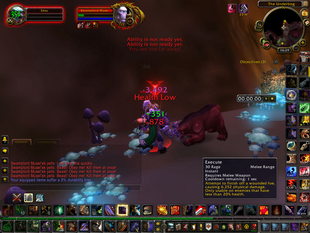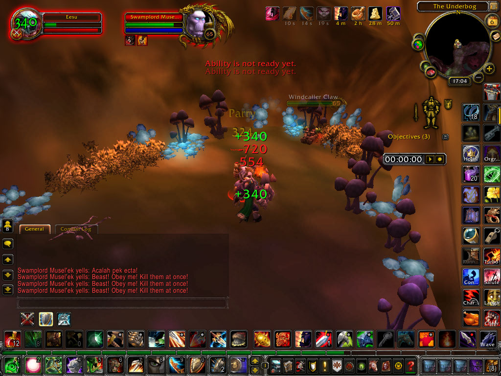 Now for the winning fight. I actually attacked the bear first on this one. And, this may sound strange because Musel'ek is a hunter, I got the feeling Musel'ek does less damage when he does it from a range. So you might wanna try staying away from Musel'ek and beating the bear out of the fight first. I will try this again one day to confirm the tactics but I'll probably be lvl 62 then. :) One thing that was left unclear to me was does the bear stop fighting when Musel'ek dies. And another thing, how far away can you run (with a swiftness potion) without the boss resetting. Anyway by the time Musel'ek laid dead most of my gear was yellow and the other mobs were no doubt minutes away from respawning. Total time I spent in Underbog was close to 3 hours. (And after checking the timers in my screenshots, an average fight against Musel'ek last between 1 minute 3 seconds and 1 minute 28 seconds. If I subdued the bear first, then the fight usually last a little longer, maybe 2 minutes.)