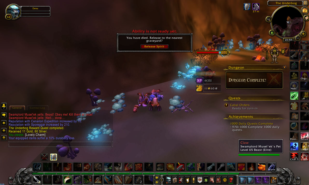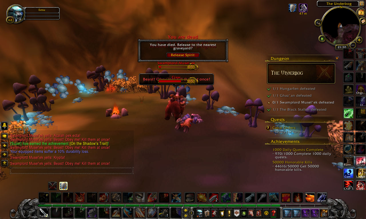 So, having in my hands a more powerful character than ever before I needed to find a proper challenge to test how far I could go. I was already picturing in my mind the raid bosses of Ahn'Qiraj and Molten Core, but I wanted to start easy so I blazed through Hellfire Ramparts, Blood Furnace and Slave Pens in record speed (personal record anyway). Moving on to Underbog, the first two bosses gave me no trouble so I didn't think Musel'ek would prove to be a challenge either. I did stop before him, checked from Dungeon Journal that he and the bear should only do physical damage and dug up my notes from the previous encounter with him. My notes suggested that going against the bear first might be a good tactic. So I attacked the bear. Big mistake. :)