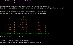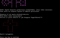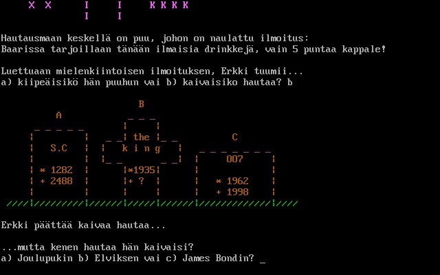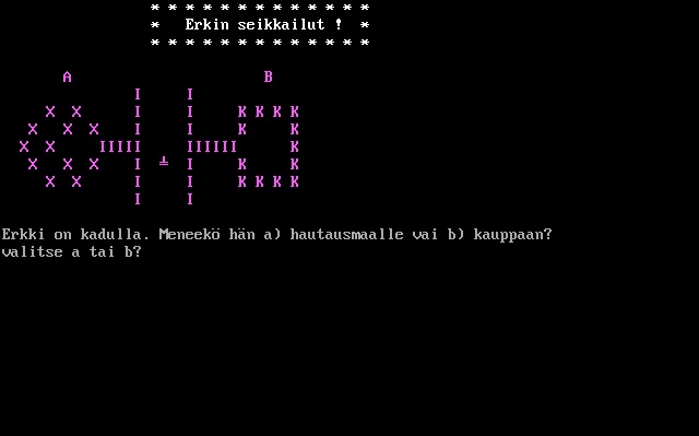 Ohjeet Erkin seikkailujen pelaamiseen: lataa täältä DOSBox, tästä QBasic ja kopioi alla olevasta "Erkin seikkailujen koodi"-linkistä pelin koodi vaikkapa Notepad- eli Muistio-ohjelmaan. Tallenna Notepad-tekstitiedosto esimerkiksi nimellä ERKKI.BAS (Jotkin selaimet, kuten oman koneeni Google Chrome, eivät näytä pelin koodin ä- ja ö-kirjaimia oikealla tavalla väärin, joten jos haluat olla varma, että ne toimivat pelissä, lataa peli tästä RTF-muodossa ja tallenna se sitten koneellasi uudestaan Plain Text -muodossa ANSI-koodauksella nimellä ERKKI.BAS. Tekstinkäsittelyohjelmasi kysyy luultavasti varmistuskysymyksen, johon vastaat kyllä. Ä- ja ö-kirjaimet eivät silloinkaan näy kunnolla tekstitiedostossa, mutta toimivat pelissä). Siirrä lataamasi QBASIC.EXE ja ERKKI.BAS -tiedostot sellaiseen kansioon, josta löydät ne kohta DOSBoxin komentokehotteella (helpoin paikka olisi jonkin aseman juuresta, mutta voit tallentaa tiedostot minne tahansa, esim. Työpöydälle). Asenna ja käynnistä DOSBox. Kirjoita DOSBoxin komentokehotteeseen ilman heittomerkkejä "mount c: c:/" ja paina enter (DOSBox ei suosittele koko C-aseman mounttaamista, mutta itsellä se on toiminut ihan hyvin). Kirjoita sitten "c:" ja paina enter. Jos QBasic ja Erkki ovat c-aseman juuressa, niin voit nyt käynnistää QBasicin kirjoittamalla DOSBoxiin "qbasic" ja painamalla enter. Jos tiedostot ovat jossain muualla, niin etsitään ne. Saat listauksen c-aseman juuressa olevista kansioista ja tiedostoista syöttämällä DOSBoxiin "dir/p". Kaikki, joiden perässä lukee <DIR> ovat kansioita. Omalla koneellani Windowsin työpöytä löytyy kansiosta c:\Users\Elias\Desktop. Pääset DOSBoxilla kansioon syöttämällä "cd Users", jossa Users on siis kansion nimi. Jos menit väärään kansioon, pääset takaisin syöttämällä "cd.." (tässä opit samalla käyttämään vanhaa DOS-käyttöjärjestelmää). DOSBox osaa täydentää kansion tai tiedoston nimen lopun, kun kirjoitat muutaman kirjaimen ja painat tabulator-painiketta näppäimistöltä. Kun olet oikeassa kansiossa, käynnistetään QBasic komennolla "qbasic".